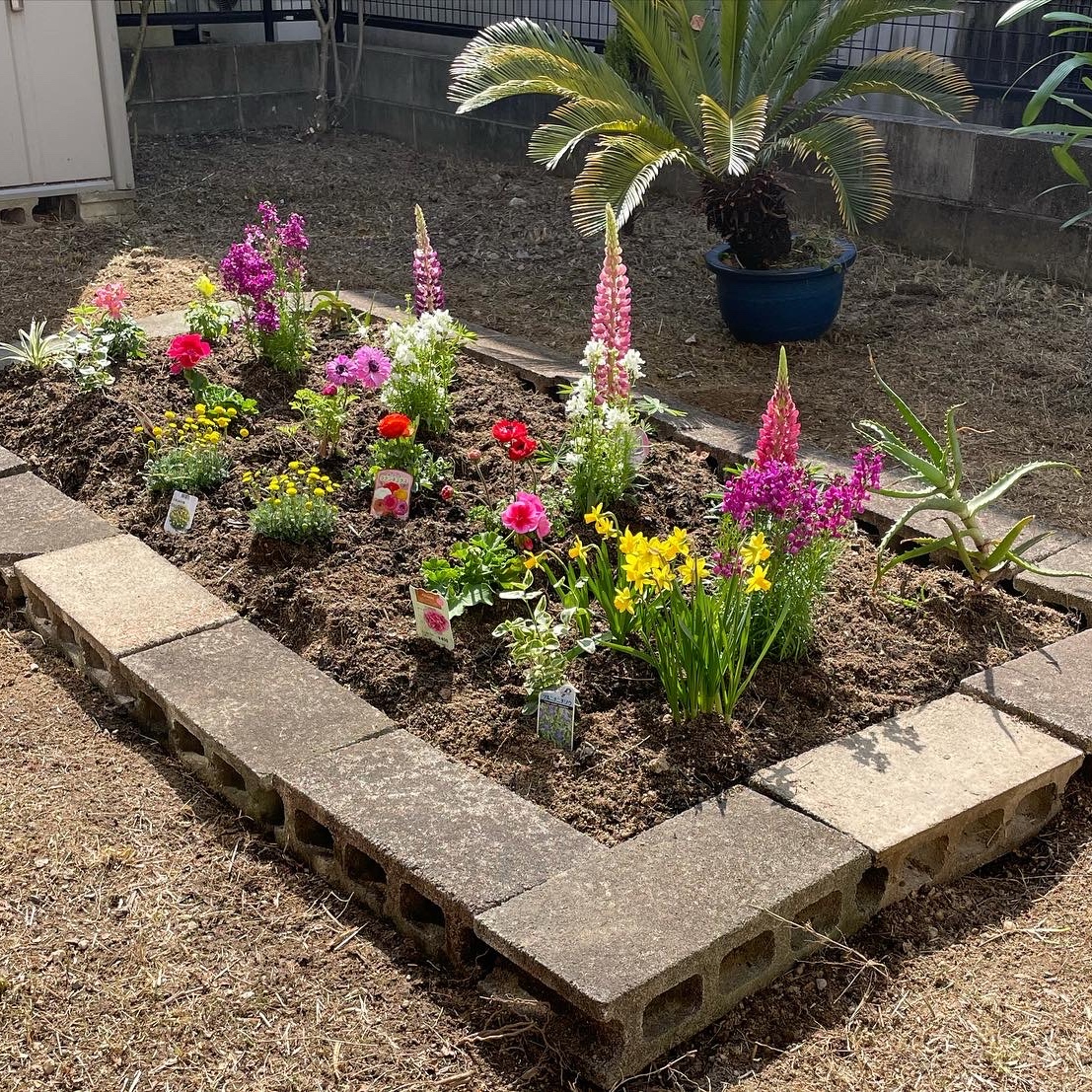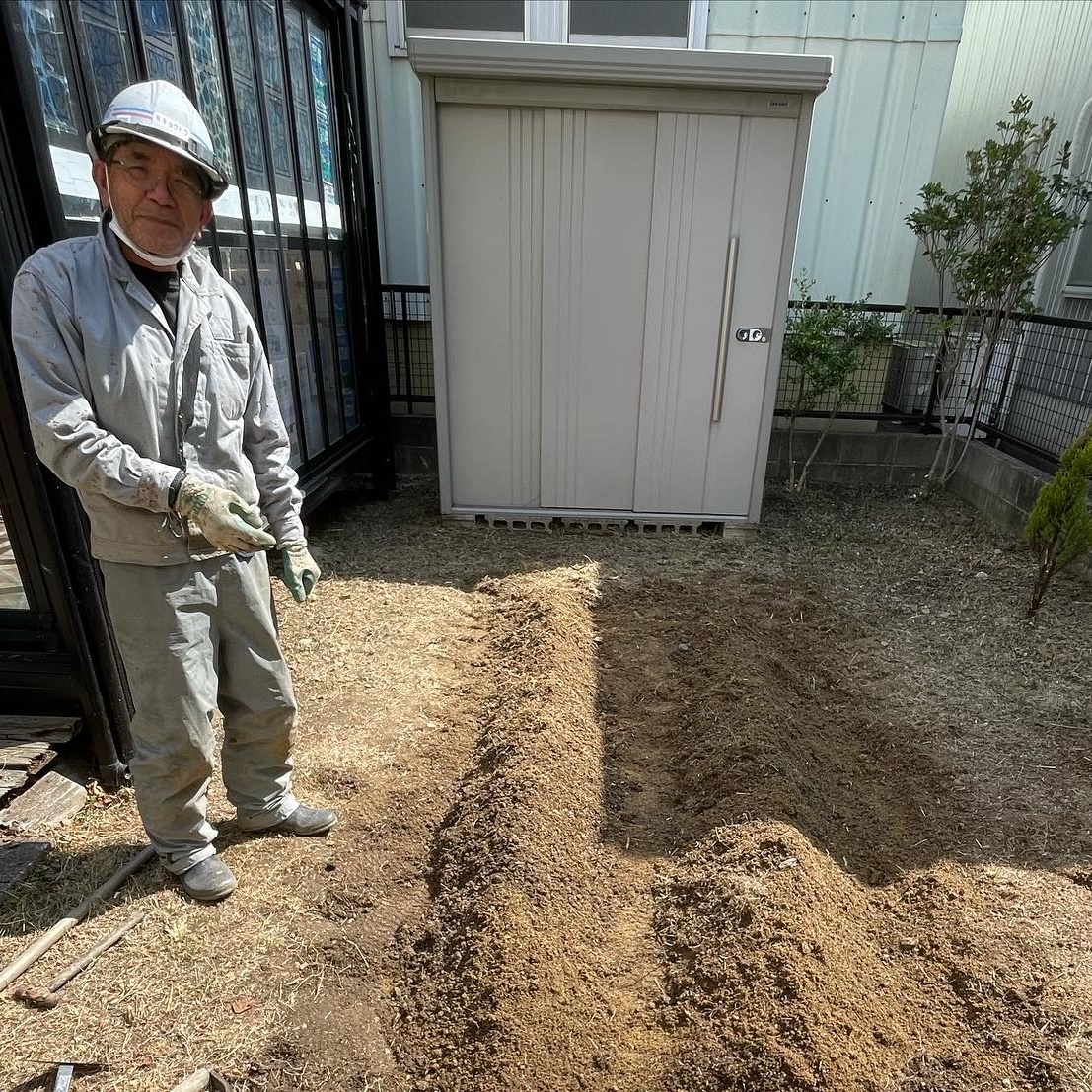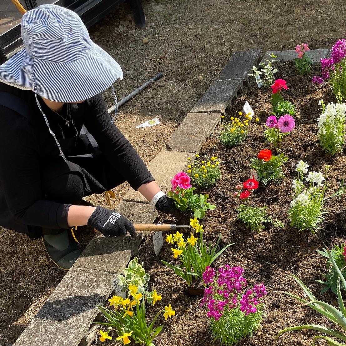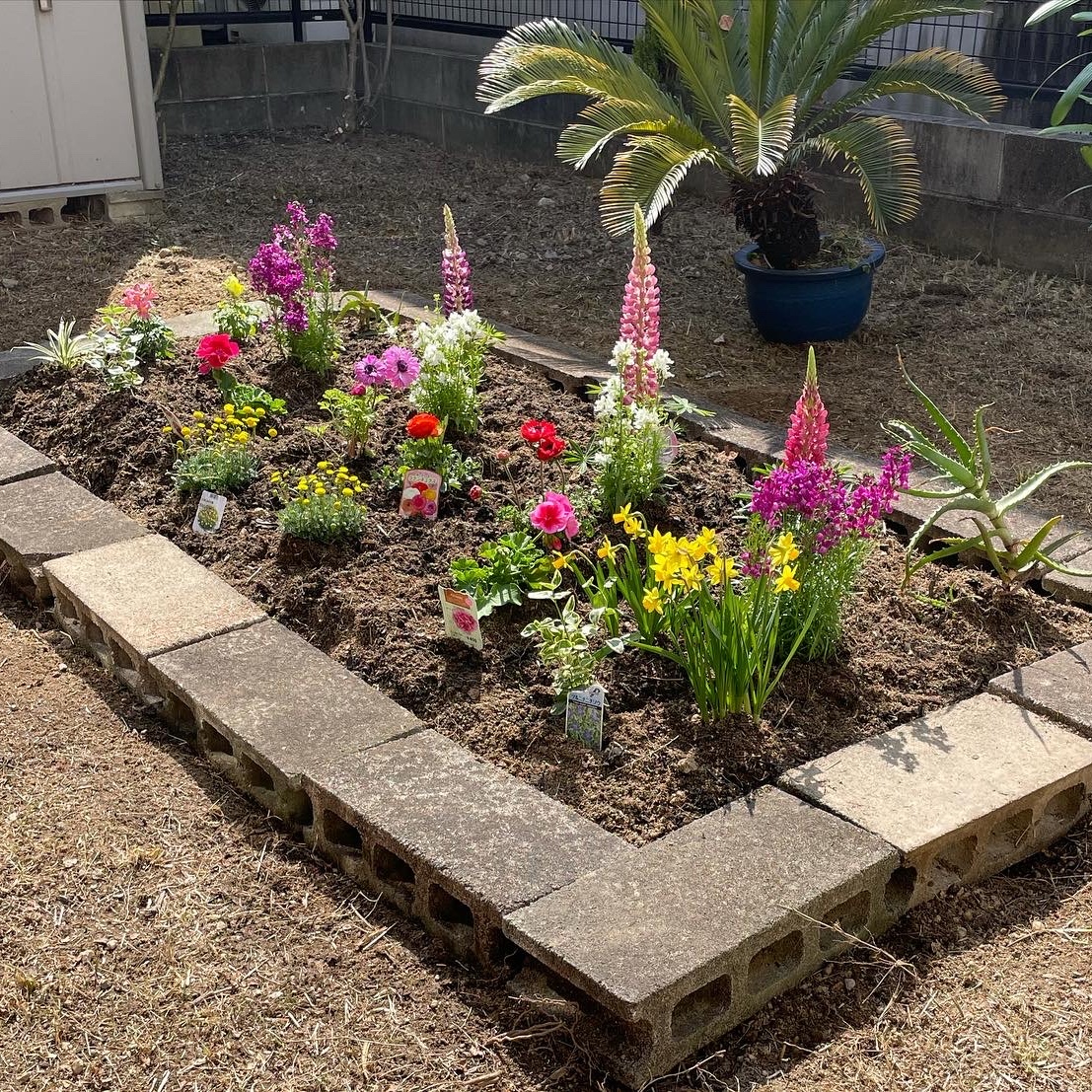 花壇スペースにレンガを置いて、堆肥を混ぜて行きます。お客様と花の購入に同行しました。色とりどりのキレイな花壇になりました。
