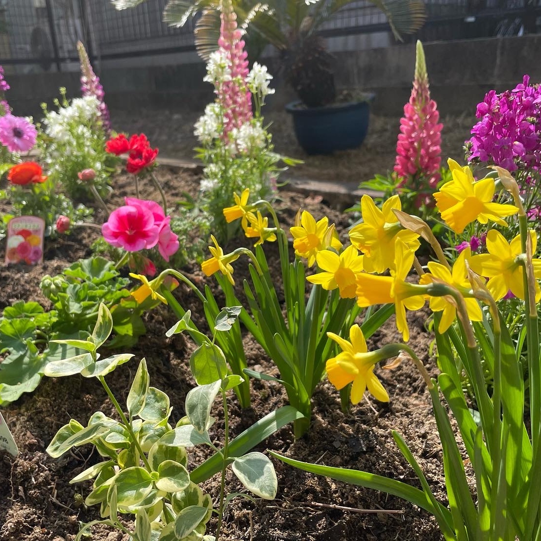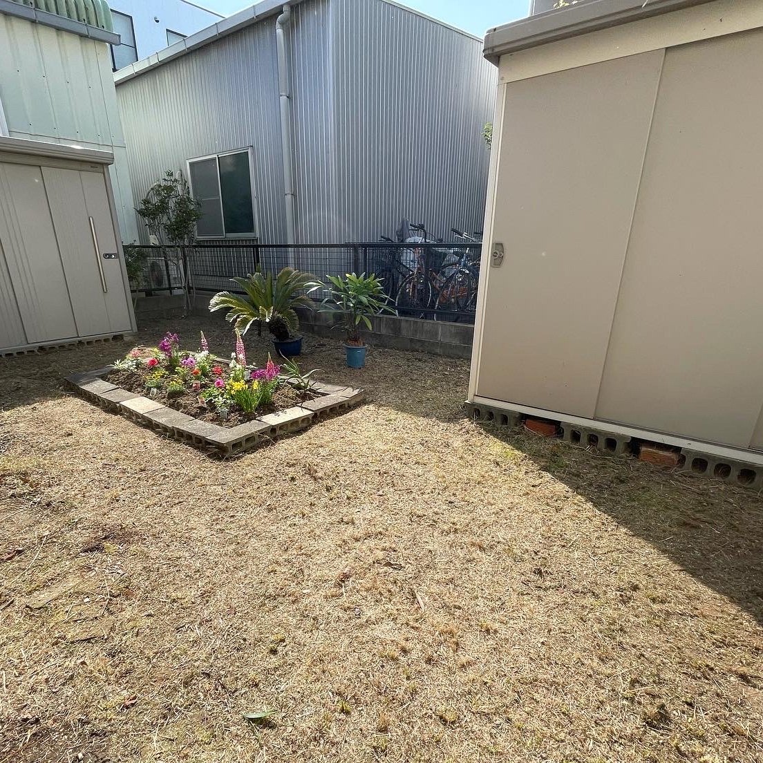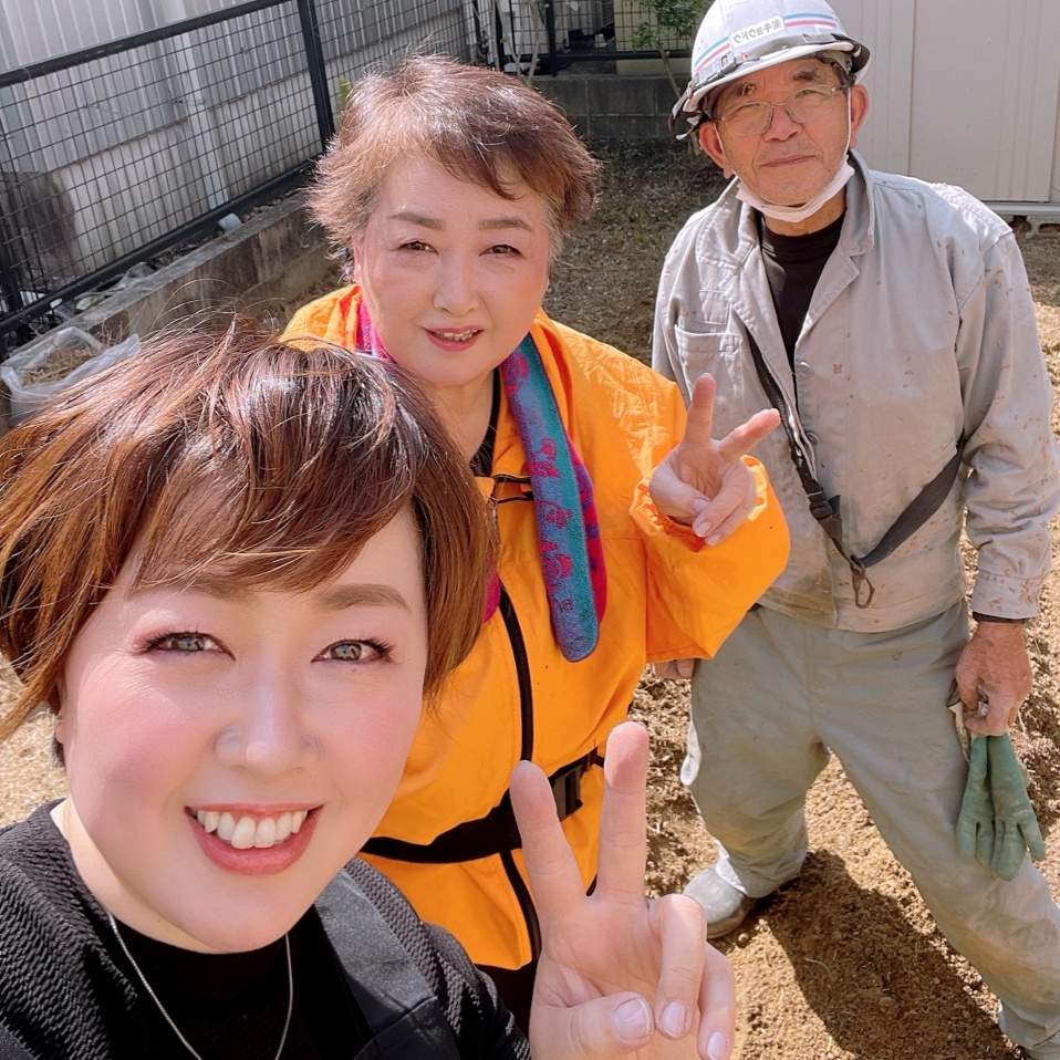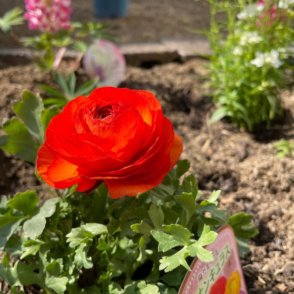 花壇スペースにレンガを置いて、堆肥を混ぜて行きます。お客様と花の購入に同行しました。色とりどりのキレイな花壇になりました。